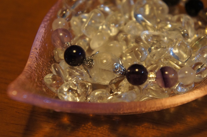 ハートの入れ物に水晶のさざれ石を乗せたもの、さらにアメジストかローズクオーツがついてくるというので迷わずアメジストをチョイス。