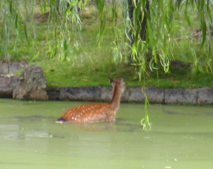 歩いてる途中池?につかりこんでむしゃむしゃと柳を食べてる鹿さん。
