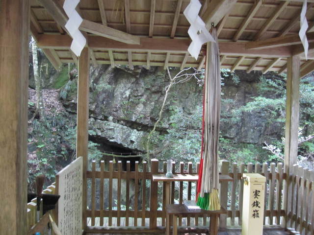 川の上に拝所(奥宮)。その対岸にみえるのが、龍穴。