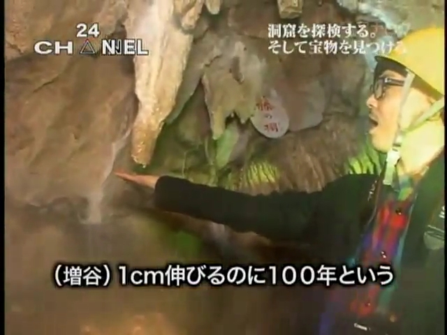 鍾乳洞の中。解説そっちのけで手のひらに雫を楽しそうに受けてます。