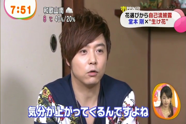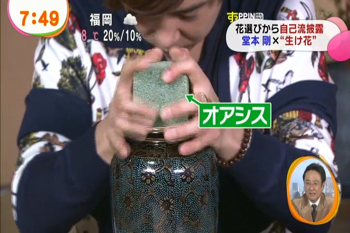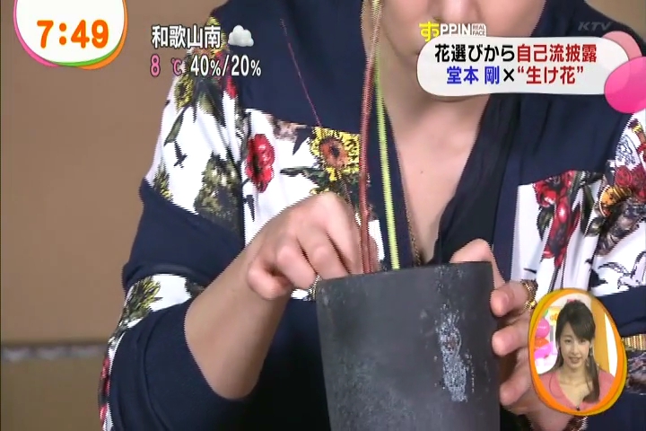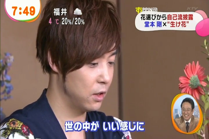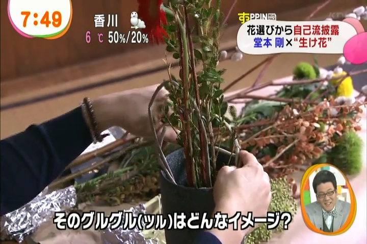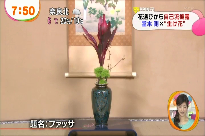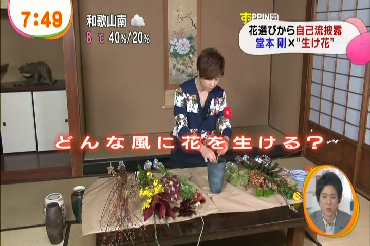 黙々と生けてる剛さんに、インタビュアさんがそれはどういう意味でとか聞いてるんだけど、これまた剛さんも世界がうまくまとまるようにとか適当なこと答えつつ。