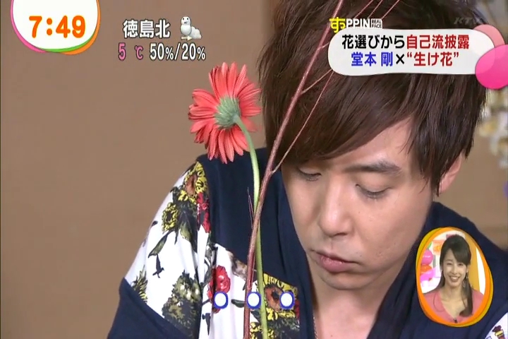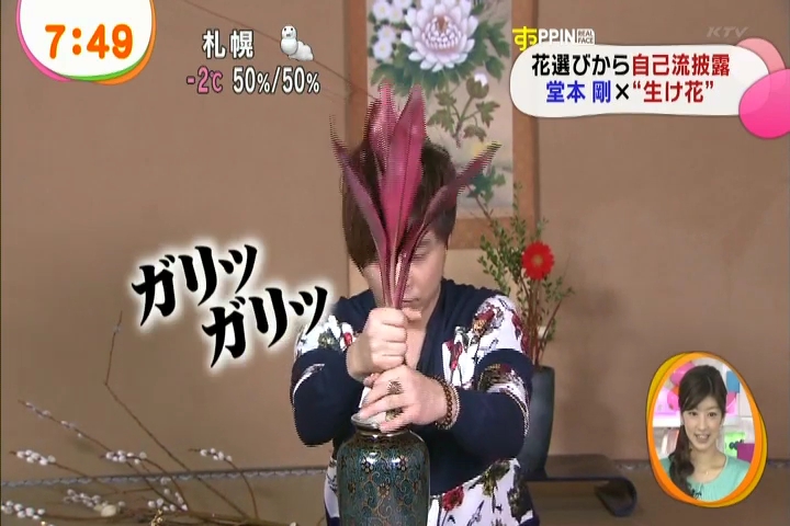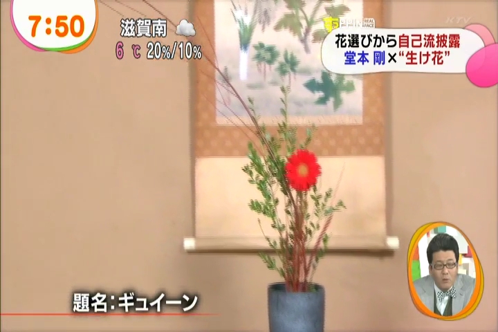 黙々と生けてる剛さんに、インタビュアさんがそれはどういう意味でとか聞いてるんだけど、これまた剛さんも世界がうまくまとまるようにとか適当なこと答えつつ。