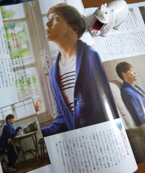 ■つぶやき「表紙は堂本剛くん。キュートなカバとのコラボ(←すごい字面だー)を堪能ください!また、裏表紙の裏にもステキな剛さんがいますのでお忘れなく。その撮影では終始ノリノリの剛さん。まるでペットのように寄り添うカバたちのお母さん(お父さん)みたい!?」